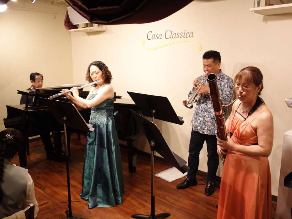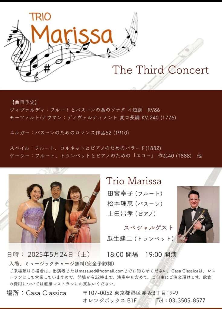 本日の東京クラシック ライブハウス 赤坂カーサクラシカは、貸切公演でした。Trio Marissaの皆さまによるコンサートで、ピアノ、フルート、ファゴット、トランペットによるクラシックから演歌まで!素敵なアンサンブルを聴かせてくださいました。お客さまも思い思いのお食事やお飲み物と共に音楽を楽しまれ、コンサートの後はご歓談タイムも大変盛り上がっていらっしゃいました。演奏に、お食事に、親しいお友達やお仲間と共に過ごす時間を演出できるカーサクラシカの貸切、どうぞお気軽にお問合せ、ご利用くださいませ☆詳しくはこちらをどうぞ♪