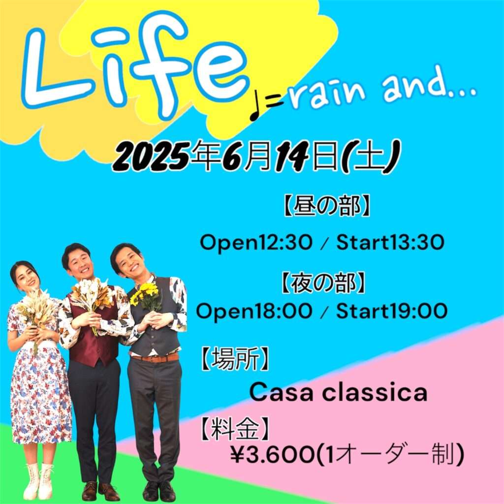 6月14日(土)昼の部・夜の部 Life~♩=rain and~ 本多羅偉(ヴォーカル)南颯希(ヴォーカル)おっち(エレクトーン)