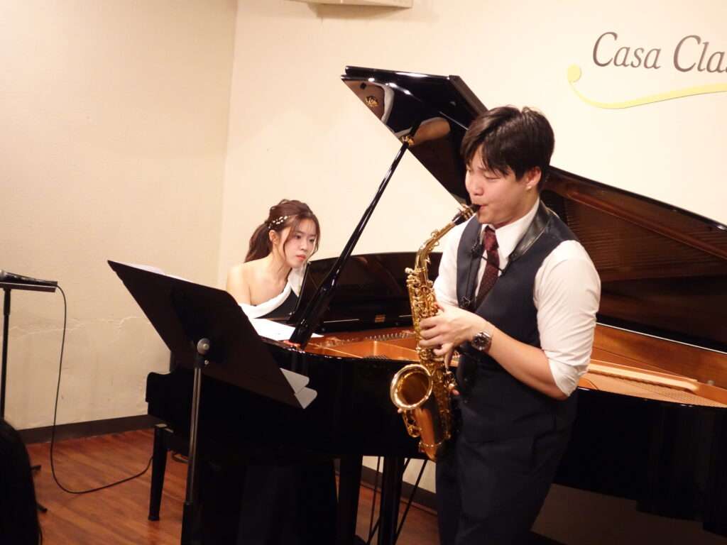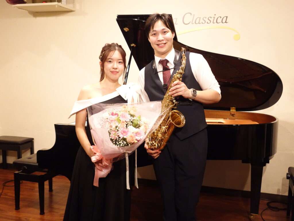 本日の東京クラシック ライブハウス 赤坂カーサクラシカは、加藤光紀さん(サックス)、山岸音々さん(ピアノ)のご出演でした。クラシック作品メインの1stステージの後につづいて昭和歌謡満載の2ndステージという構成でお楽しみただいたDuo Concertでした。サックスの甘美な響きに凛としたピアノの打鍵が心地よい演奏に加えて、お客さま方の笑い声と拍手喝さいが鳴り響く素敵な夕べでした。休憩中そして終演後も出演者との親しい会話を楽しんでいらっしゃるみなさまの笑顔がなんとも微笑ましいライブでした。これからのご活躍が楽しみなお二人、本当にありがとうございました。