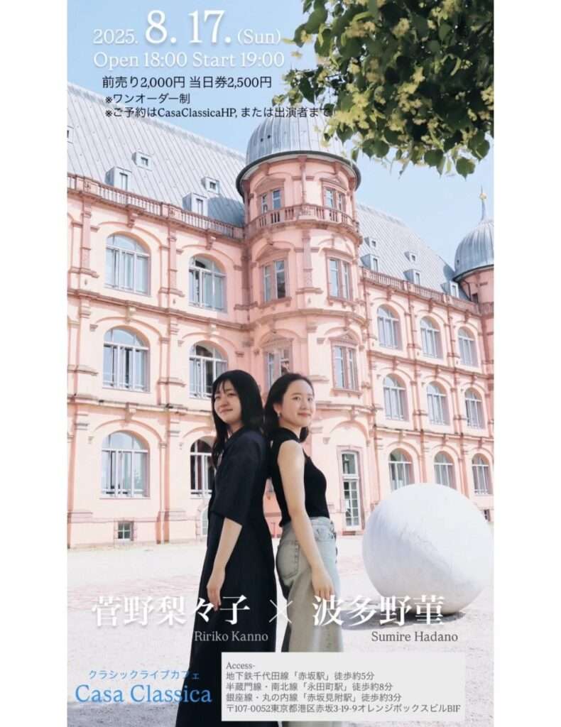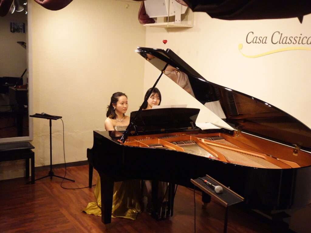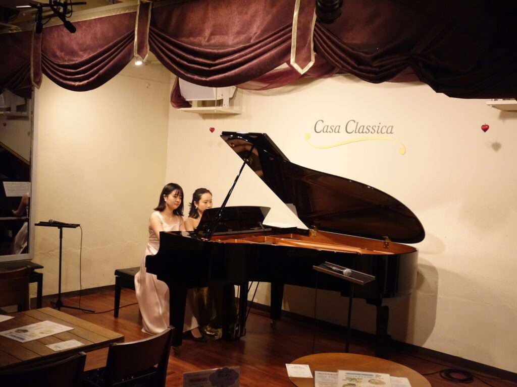 本日の東京クラシック ライブハウス 赤坂カーサクラシカは、菅野梨々子さん(ピアノ)波多野菫さん(ピアノ)のご出演でした。4手連弾からスタートして、それぞれのソロに続き連弾へと、プログラム構成も緩急をつけたノリの良い2ステージでした。クラシックのみでなくポップスレパートリーのアレンジも交えての選曲で、ピアノの魅力に満ちあふれた夕べでした。曲間のMCではお二人が出会った留学先ドイツでの日常トークがちらほらと垣間見え、会場のみなさまの微笑みを誘っていました。これからのご活躍が楽しみなお二人、また次回のご出演を心よりお待ちしております。