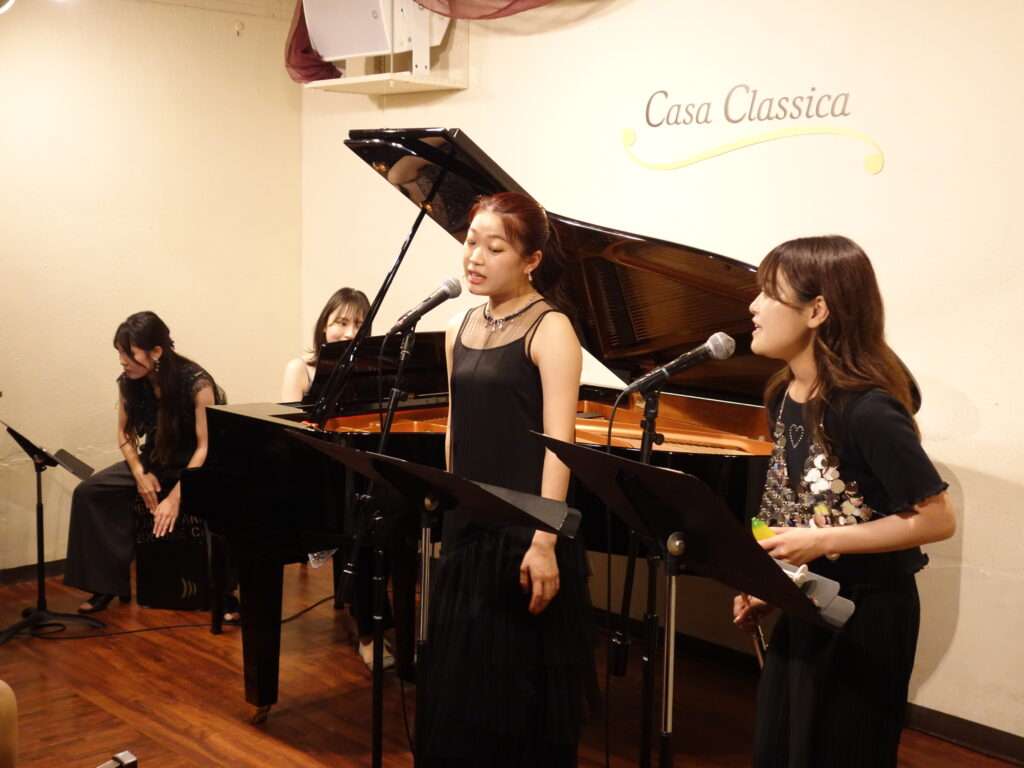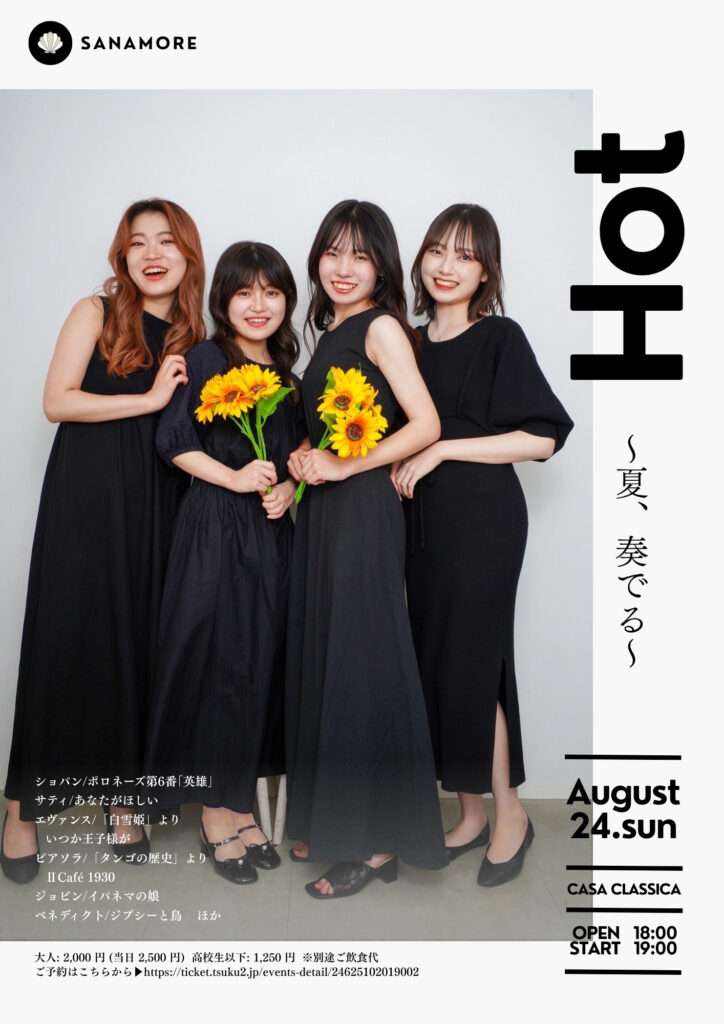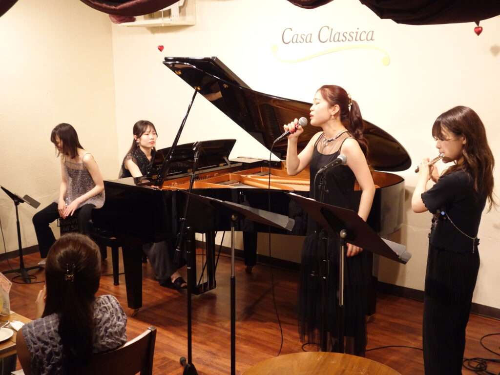本日の東京クラシック ライブハウス 赤坂カーサクラシカは、サナモレ 井上さくらさん(フルート・ヴォーカル)小谷桃佳さん(ヴォーカル・クラリネット)齋藤玲奈さん(ピアノ)久米菜々美さん(ピアノ)ご出演でした。HOT〜夏、奏でる〜のタイトルで、1stステージはクラシックの曲を中心にソロ曲やフルートと歌の掛け合いが楽しいデュオや、ピアノ連弾をおおくりくださいました。2ndステージはガラッと変わった雰囲気で、ミュージカル、ジャズやポップスの曲で客席の皆さまを楽しませていらっしゃいました。カホンが加わったり、皆さまの多才ぶりも垣間見れるステージでした!魅力たっぷりのライブをお届けくださった皆さま、またのご出演もお待ちしております🌟