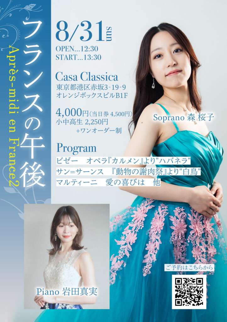 8月31日(日)昼の部 フランスの午後 Après-midi en France vol.2 森桜子(ソプラノ)岩田真実(ピアノ)