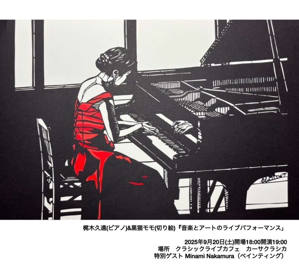 9月20日(土)夜の部 梶木久遠(ピアノ)黒猫モモ(切り絵師)Minami Nakamura(ペインティング)