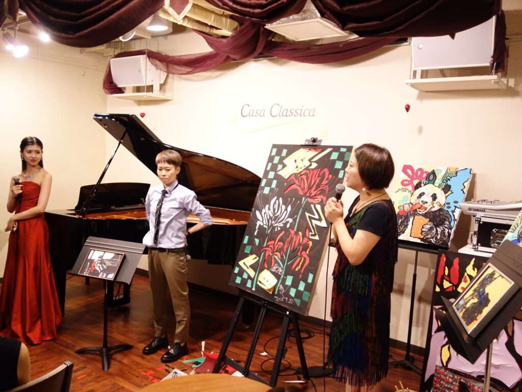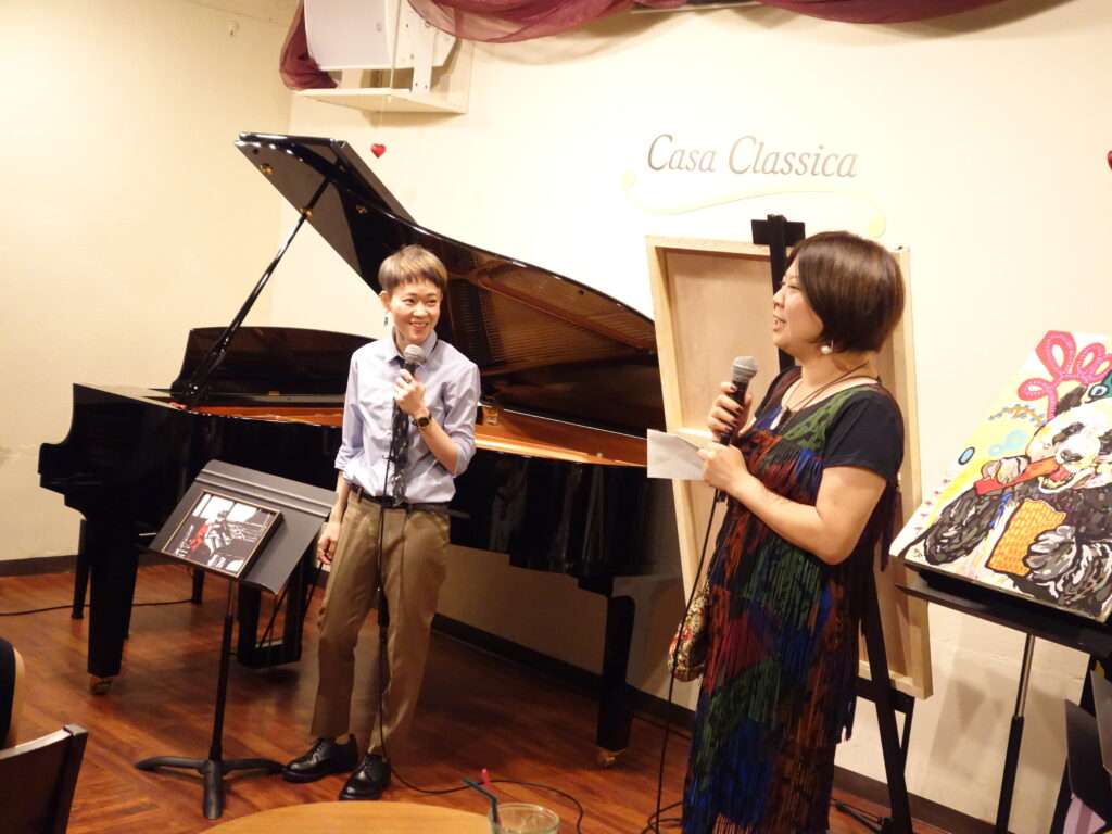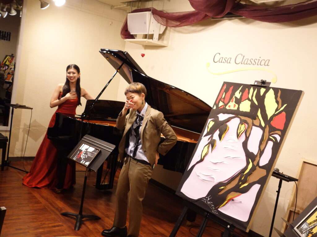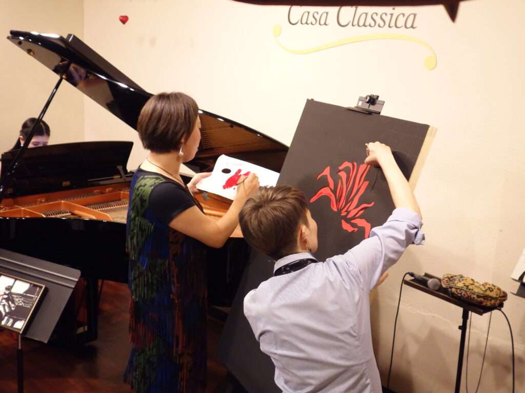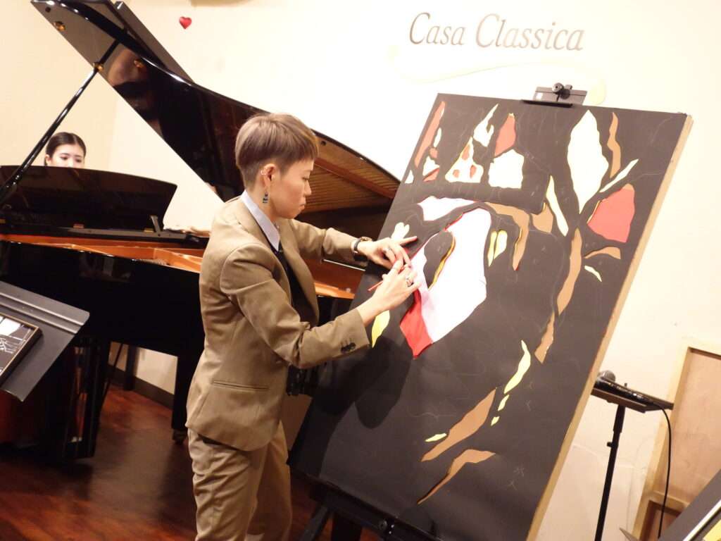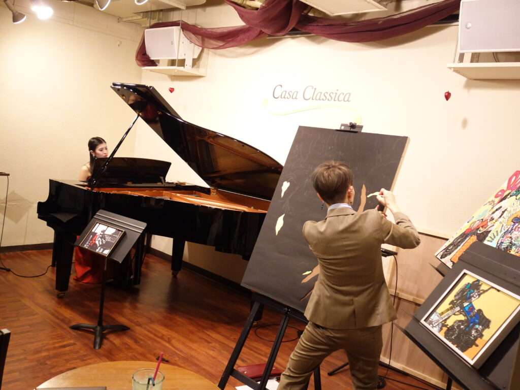 本日の東京クラシック ライブハウス 赤坂カーサクラシカは、梶木久遠さん(ピアノ)、黒猫モモさん(切り絵師)、Minami Nakamuraさん(ペインティング)のご出演でした。クラシック×切り絵、ピアノソロ、ポップス×切り絵×ペインティングと3つのステージでお届け下さり、アートと音楽と2つの芸術を1度に体感できるなんとも贅沢な時間でした。クラシックの繊細で美しいピアノの音色と切り絵とポップスの情熱的で力強い音色と切り絵とペインティング、芸術の無現な可能性を感じました。普段、なかなか生で見ることのないライブパフォーマンス、素敵な楽しい時間をありがとうございました!またのご出演を心よりお待ちしております。