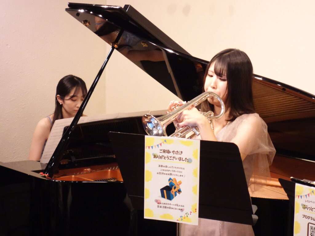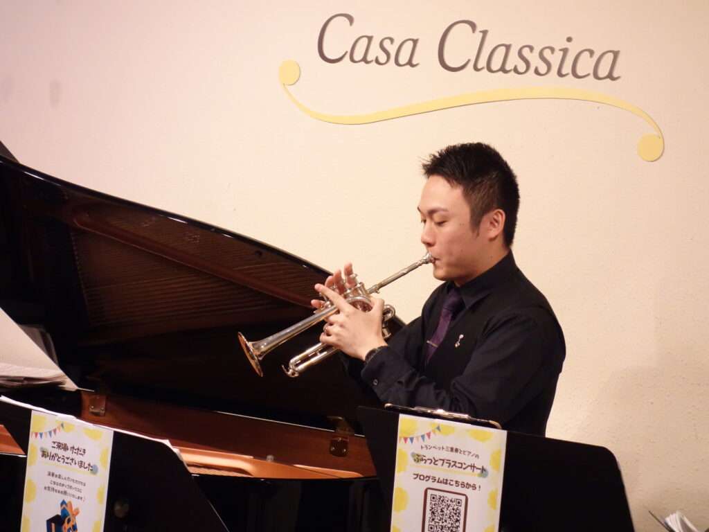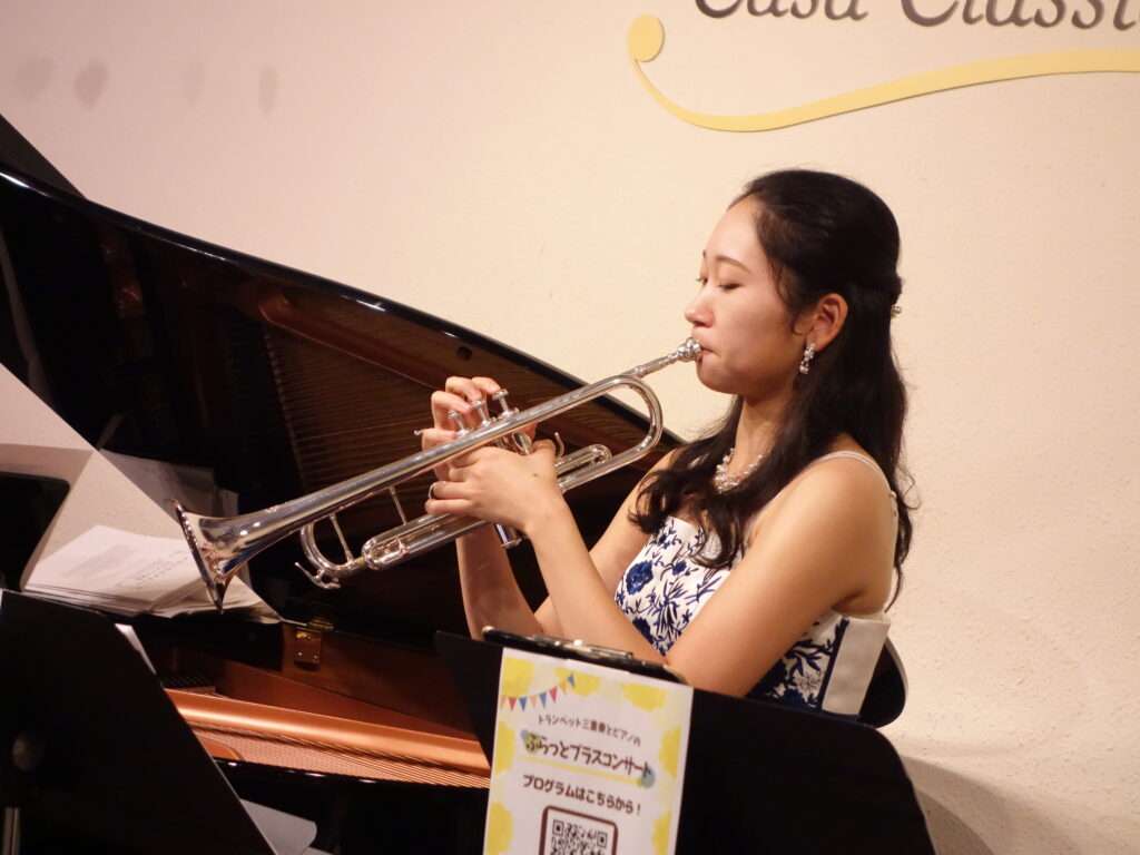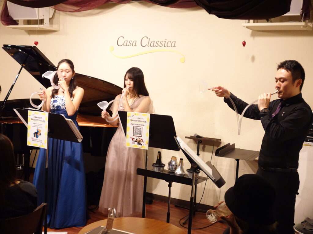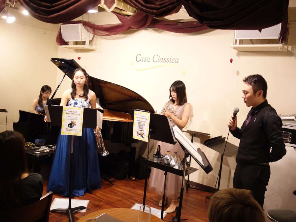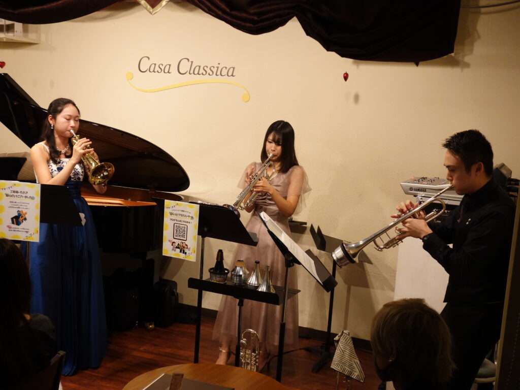 本日の東京クラシック ライブハウス 赤坂カーサクラシカは、トランペット三重奏とピアノのぷらっとブラスコンサートで、神山巧弥さん(トランペット)、岡田彩音さん(トランペット)、渡邉友香理さん(トランペット)、安原菜々子さん(ピアノ)のご出演でした。3人での演奏はもちろん、それぞれのソロもご披露くださいました。トランペット、コルネット、フリューゲルホルン、ピッコロトランペット、マウスピースだけの演奏に、お手製の楽器まで🌟たくさんの楽器が登場し、さまざまな楽器の音色と共に見ても楽しい!ライブとなりました。前半はクラシックを、後半は映画音楽を華やかで豪華にお届けくださいました!楽しいライブをありがとうございました。またのご出演を心よりお待ちしております。