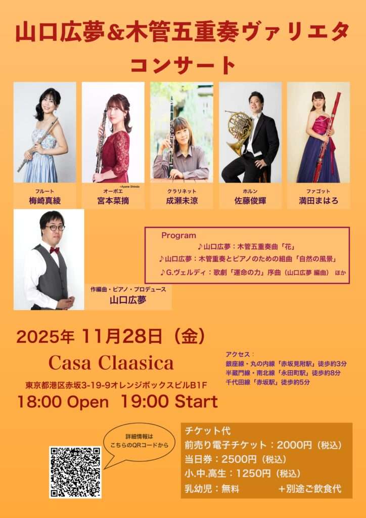 11月28日(金)夜の部 山口広夢&木管五重奏Varietà 梅崎真綾(フルート)宮本菜摘(オーボエ)成瀬未涼(クラリネット)佐藤俊輝(ホルン)満田まはろ(ファゴット)山口広夢(ピアノ)