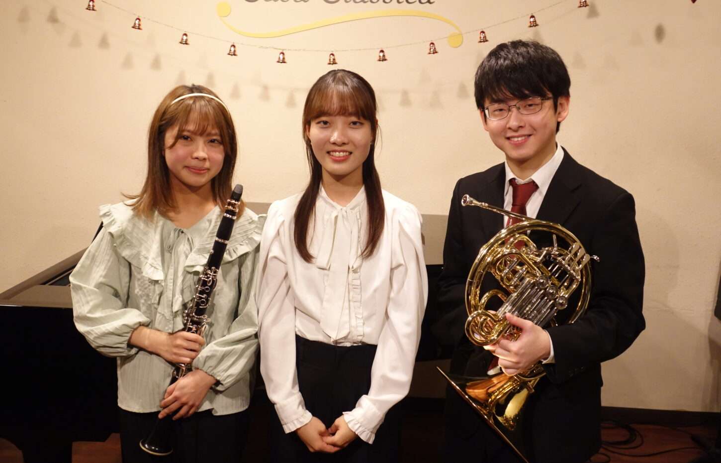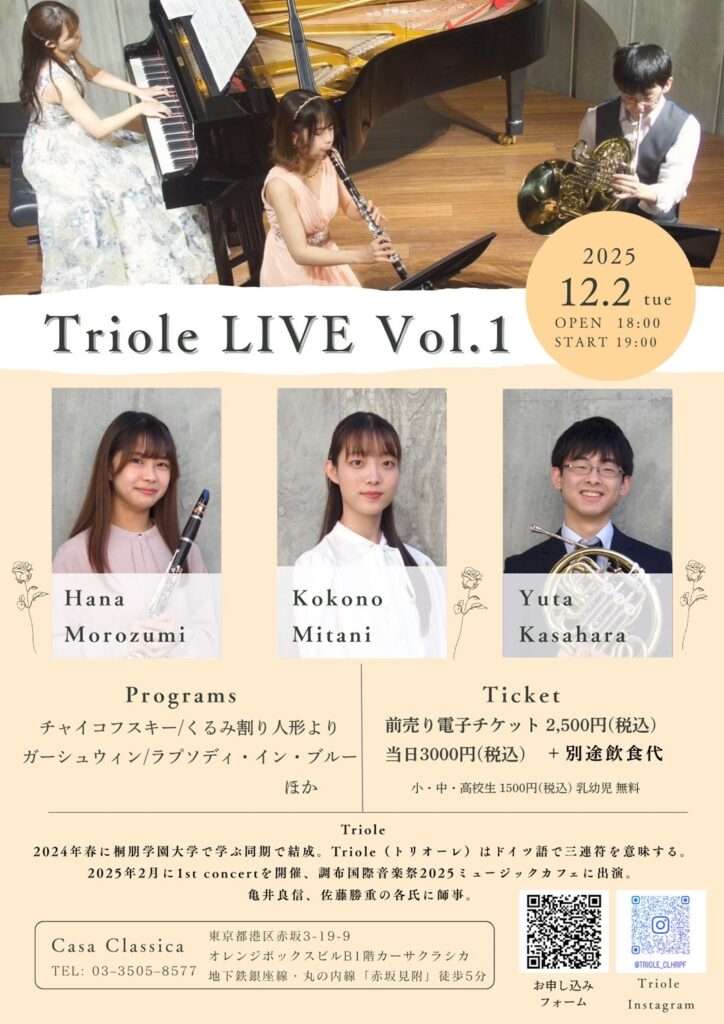 本日の東京クラシック ライブハウス 赤坂カーサクラシカは、Trioleの両角華さん(クラリネット)、笠原優太さん(ホルン)、三谷心乃さん(ピアノ)のご出演でした。同じ大学でクラシックを学ばれているというお三方。クラリネットとホルンの優しく温かい音色とピアノの艶やかな音色でお届けくださる映画音楽、ポピュラー音楽などの名曲の数々にお客さまも聴き入っていらっしゃいました🎶素敵な時間をありがとうございました!これからの活躍が楽しみな皆さま、またのご出演を心よりお待ちしております。