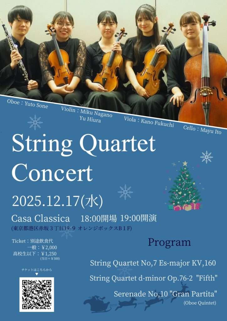 12月17日(水)日浦優(ヴァイオリン)長野未空(ヴァイオリン・ヴィオラ)福地香乃(ヴィオラ)伊藤真優(チェロ)曽根佑羽(オーボエ)