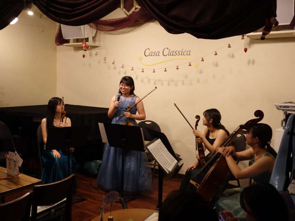 本日の東京クラシック ライブハウス 赤坂カーサクラシカは、日浦優さん(ヴァイオリン)、長野未空さん(ヴァイオリン・ヴィオラ)、福地香乃さん(ヴィオラ)、伊藤真優さん(チェロ)、曽根佑羽さん(オーボエ)のご出演でした。前半は弦楽四重奏で弦楽器の艶やかで温かい音色を、後半はオーボエの音色が加わり、より華やかな演奏をお届けくださいました。昨年も同じ時期にご出演してくださった皆さん、1年分の実の詰まった演奏をご披露して下さり、お客さまからの温かい拍手が会場を包みました。素敵な時間をありがとうございました。これからの活躍が楽しみな皆さん、ぜひ、またのご出演をお待ちしております。