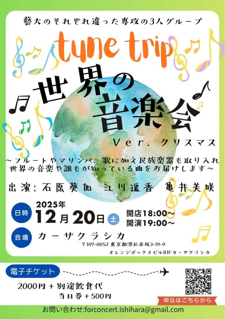 12月20日(土)夜の部 tune trip 石原葵加(フルート)江川遥香(声楽・ピアノ・ティンホイッスル)亀井美咲(打楽器)~世界の音楽会~