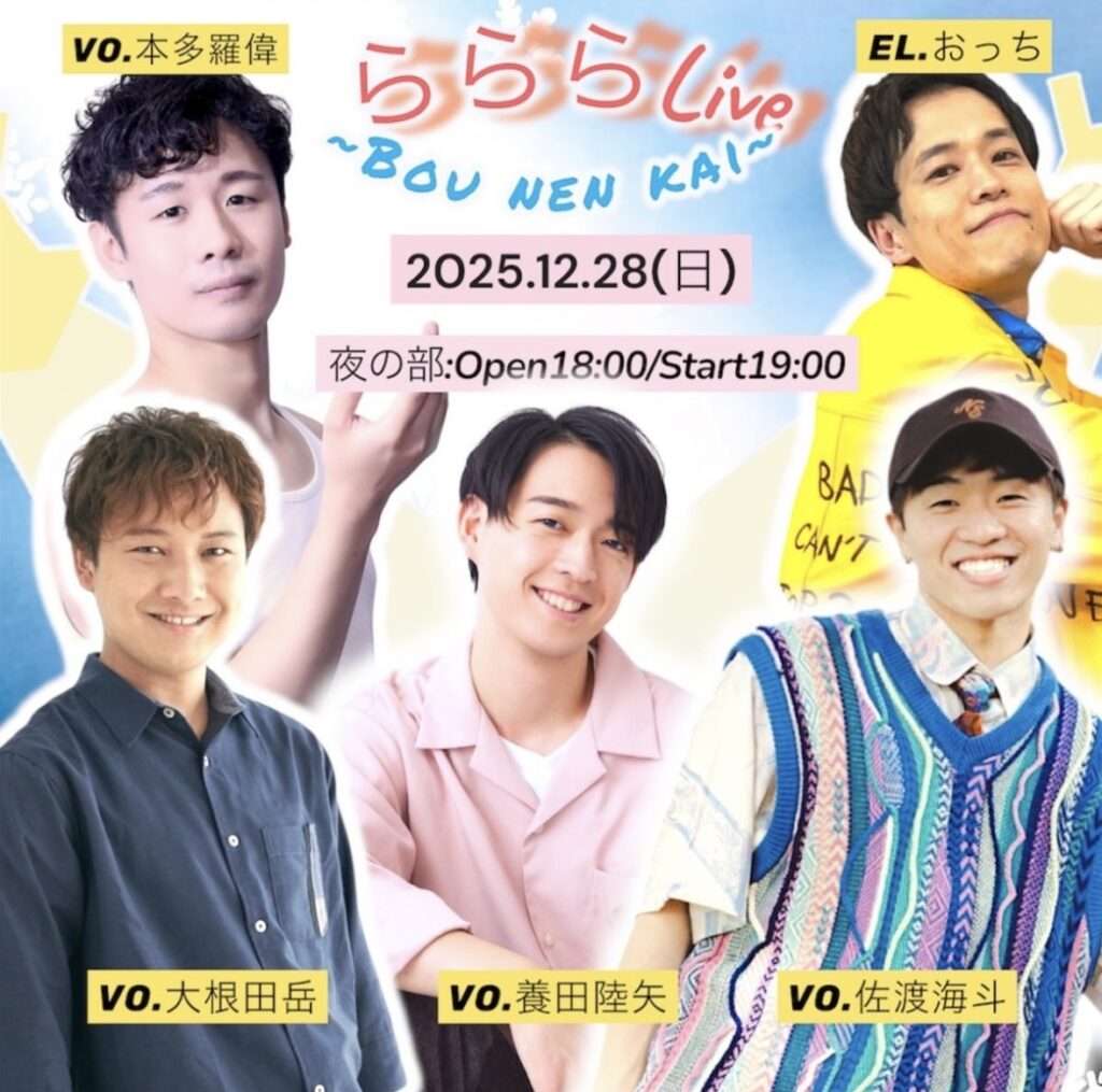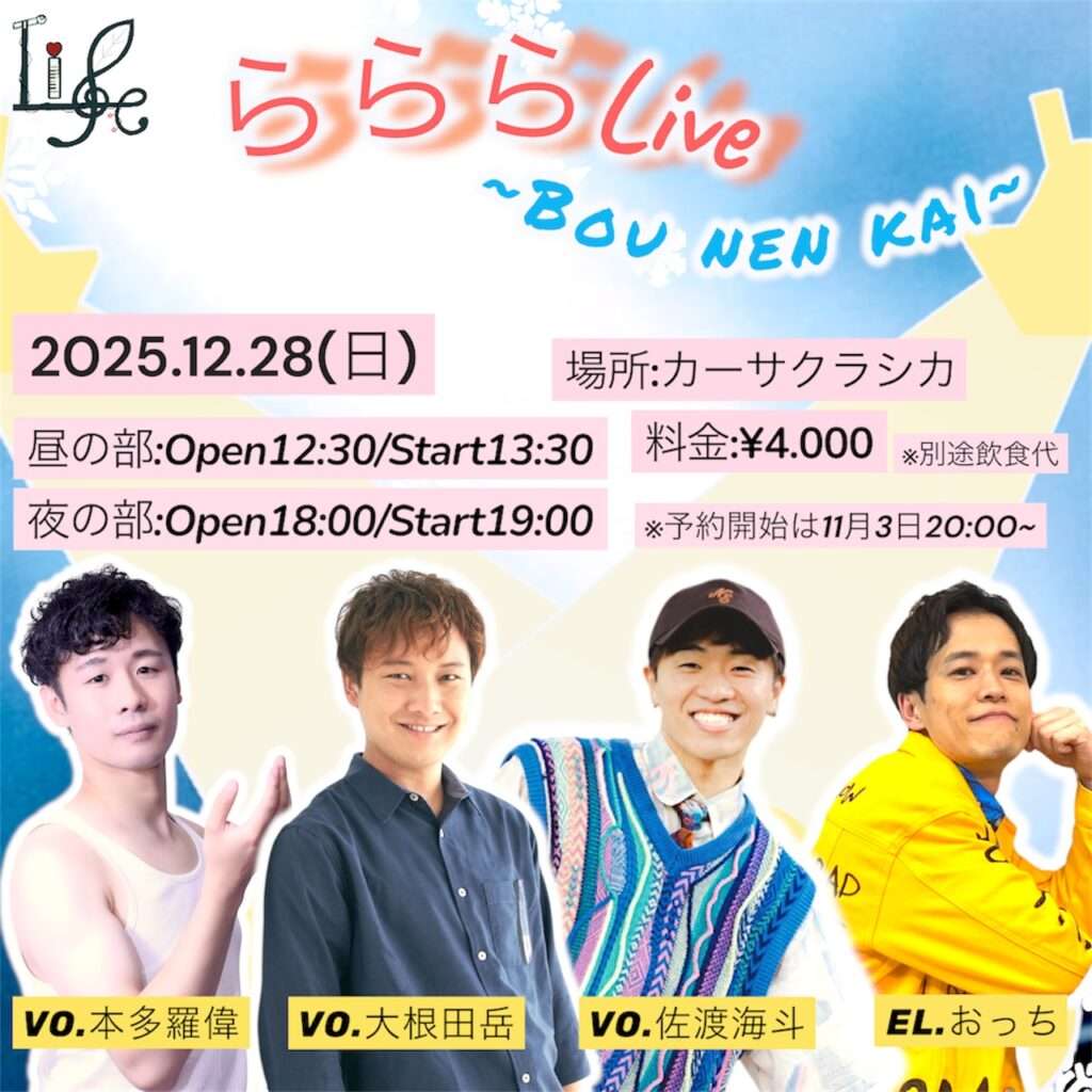 12月28日(日)昼の部・夜の部 Life 本多羅偉(ヴォーカル)大根田岳(ヴォーカル)佐渡海斗(ヴォーカル)養田陸矢(ヴォーカル)おっち(エレクトーン)らららLive