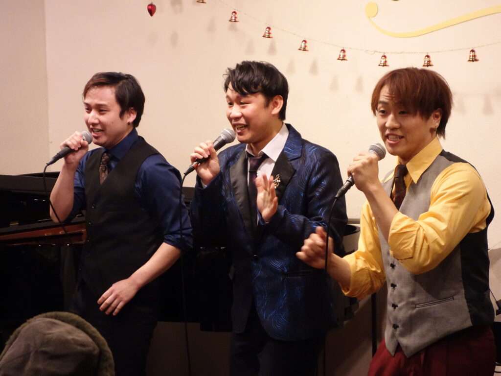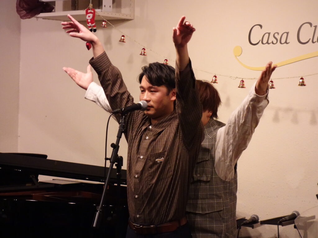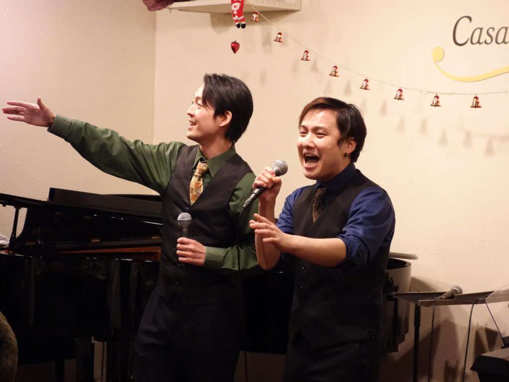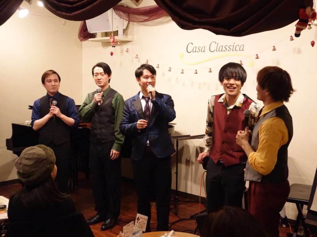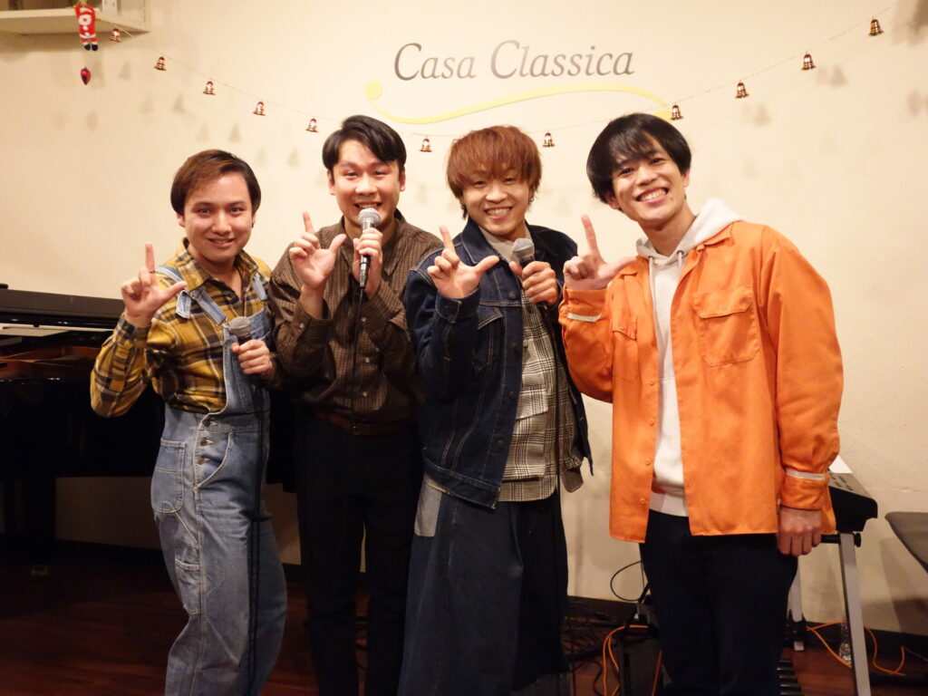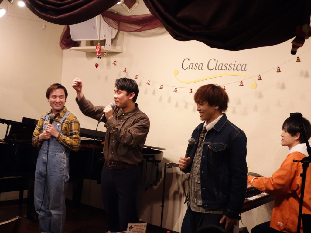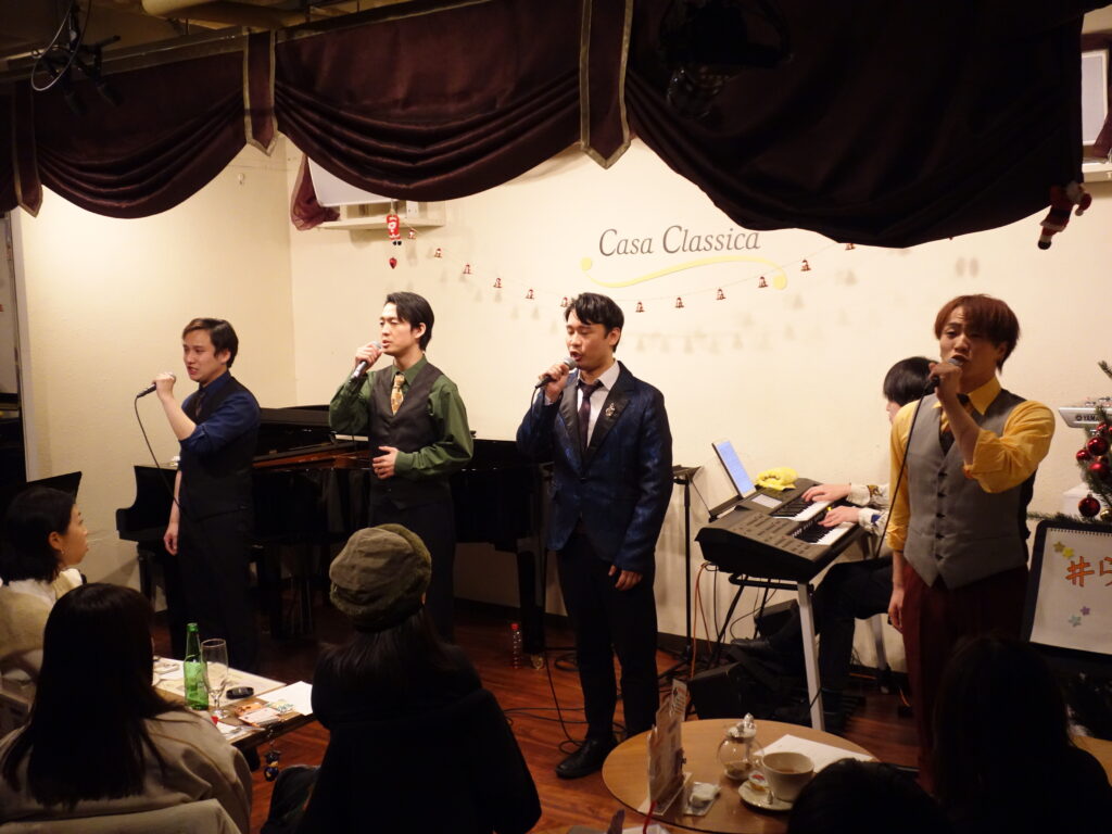 本日の東京クラシック ライブハウス 赤坂カーサクラシカは、Life 本多羅偉さん(ヴォーカル)、大根田岳さん(ヴォーカル)、佐渡海斗さん(ヴォーカル)、養田陸矢さん(ヴォーカル)、おっちさん(エレクトーン)のご出演でした。昼の部ではレトロな懐かしい名場面をソロ、デュオ、トリオで様々な趣向を凝らし、夜の部は映画音楽、ミュージカルソングで夢と憧れの世界を創り出してくださいました。お客さま方は2025年を締めくくるBOU NEN KAI【忘年会】を大いに満喫してお過ごしくださいました。たくさんの楽しい時間をお届けして下さりありがとうございました!来年もみなさまのご出演心よりお待ちしております。