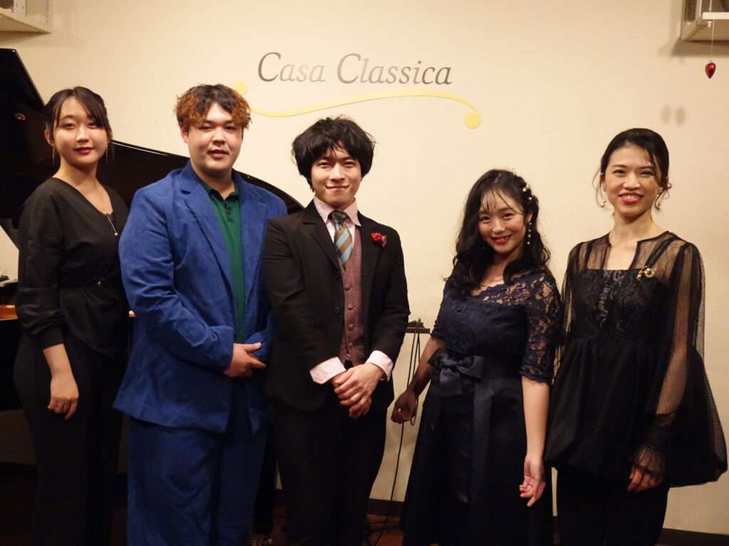 本日の東京クラシック ライブハウス 赤坂カーサクラシカは、大向しんじさん(ヴォーカル)、小林あずみさん(ヴォーカル)、佐藤菜央美さん(ヴォーカル)、渋谷樹生さん(ヴォーカル)、宮嵜琴音さん(ピアノ)のご出演でした。愛する人への想いを込めた素敵な名曲の数々をソロやデュエットなどを織り交ぜながら展開されるミュージカルシーンでお客さま方の心をしっかりと包み込んでくださいました。4人それぞれの歌声の織り合わさった力強さと安定したピアノのサポートが創りだした豪華なひとときをありがとうございました。また次回のご出演を楽しみにしております。