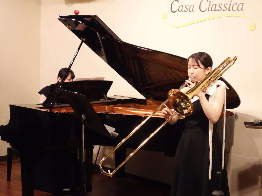 本日の東京クラシック ライブハウス 赤坂カーサクラシカは、佐々木光さん(トロンボーン)、兵頭愛美さん(ピアノ)のご出演でした☆1ステージ目は、本格クラシック曲を、2ステージでは、ミュージカル音楽をお届けくださいました。佐々木さんの柔らかく壮大で美しい音色と兵頭さんの軽やかかつ深みのある音色でお届けられる圧巻のステージにあっという間の2ステージとなりました。素敵な時間をありがとうございました。またのご出演を心より待ちしております。