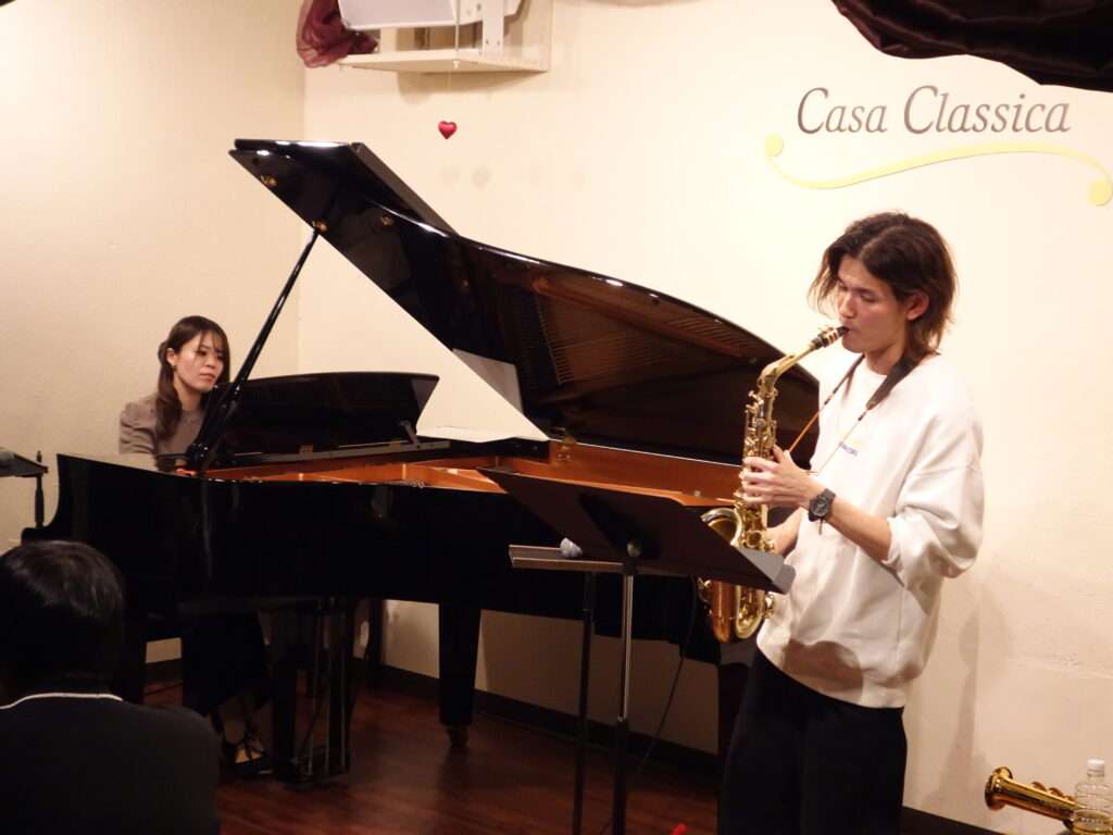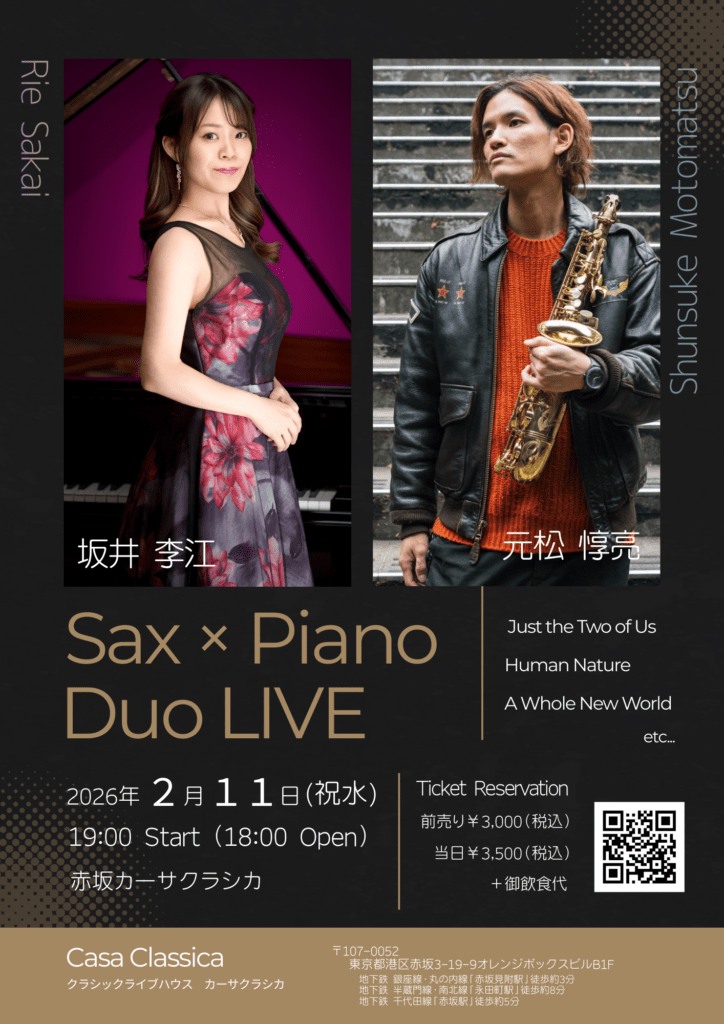 本日の東京クラシック ライブハウス 赤坂カーサクラシカは、坂井李江さん(ピアノ)元松惇亮さん(サックス)ご出演、~Sax × Piano Duo LIVE~でした。ジャズやポップス、映画音楽など人気の曲を伸びやかなサックスと心地よいピアノのデュオ、元松さんの楽しいMC、そして坂井さんのお祖母さまへ寄せたオリジナル曲のピアノソロなどを交えながら、沢山のお客さまに素敵な音楽を届けてくださいました。冬の夜に心もあたたまるひと時をありがとうございました!各地でご活躍のお2人、またのご出演もお待ちしております🌟