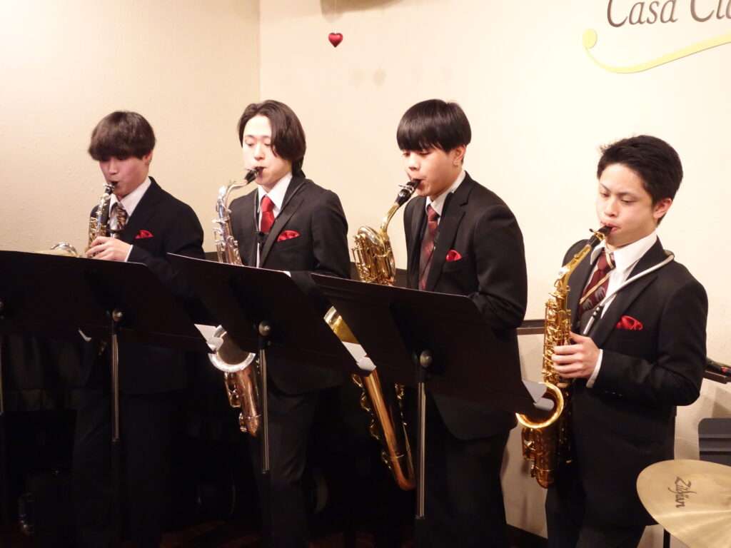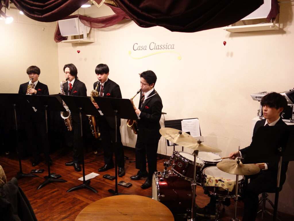 本日の東京クラシック ライブハウス 赤坂カーサクラシカは、サクソフォーンカルテット SAXERUS の藤田智也さん(ソプラノサックス)小林奏太さん(アルトサックス)小熊勇輝さん(テナーサックス)高橋悠さん(バリトンサックス)、ゲストは藤原颯大さん(ドラム)ご出演、SAXERUS×Drums藤原 -Special Sax Night-でした。サックスカルテットの魅力たっぷり、さらにドラムが加わってパワーアップした演奏を聞かせ下さり、ジャズ、ラテン、映画音楽などなど、息の合ったお洒落なアンサンブルと楽しいMCで客席を魅了していらっしゃいました。これから更なる飛躍が期待される皆さま、またのご出演もお待ちしております🌟