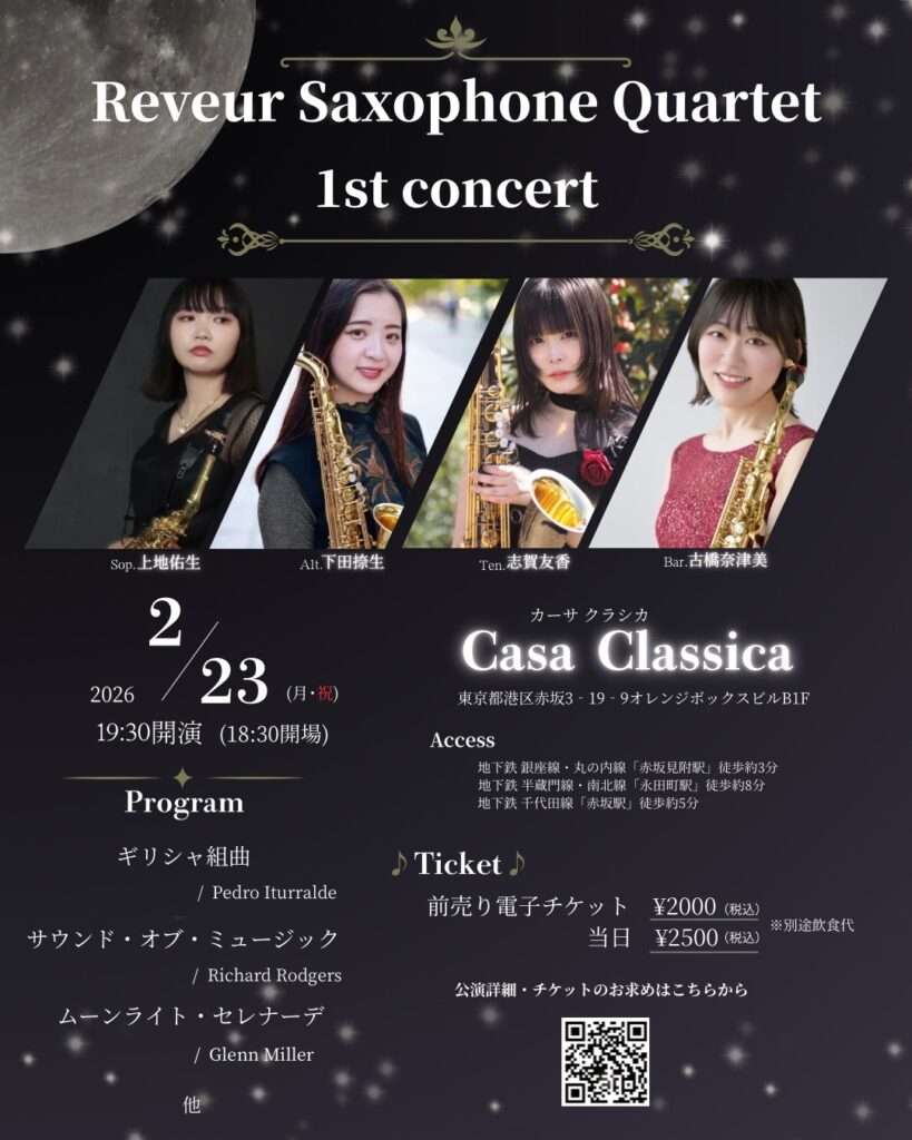 2月23日(月)夜の部 Reveur Saxophone Quartet 上地佑生(ソプラノサックス)下田捺実(アルトサックス)志賀友香(テナーサックス)古橋奈津美(バリトンサックス)~Reveur Saxophone Quartet 1st concert~