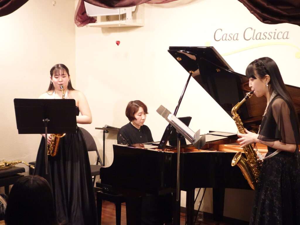 本日の東京クラシック ライブハウス 赤坂カーサクラシカは、稲垣亜優さん(サクソフォーン)MIZUKIさん(サクソフォーン)弘中佑子さん(ピアノ)ご出演、~Saxophone Duo Concert~でした。サキソフォーンの澄んだ音色で、息の合ったデュオ、ソロを聴かせてくださり、クラシックや映画音楽、それぞれの音色やピアノとの掛け合いが堪能できる素敵なプログラムで客席の皆さまを魅了していらっしゃいました。これからますますのご活躍が期待されるサキソフォーンのお2人、サポートをしてくださった弘中さん、またのご出演もお待ちしております!