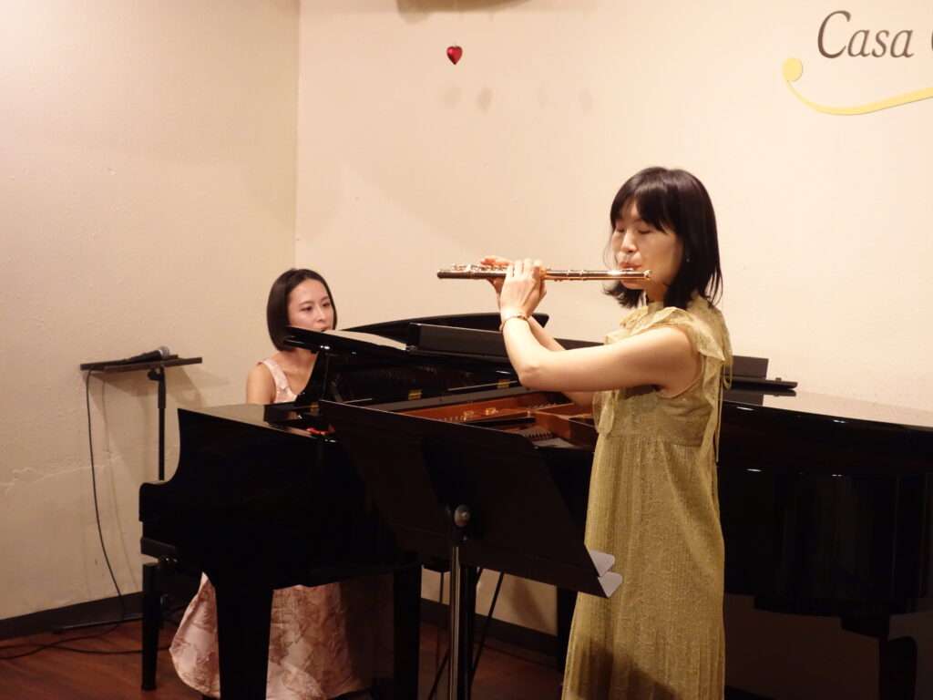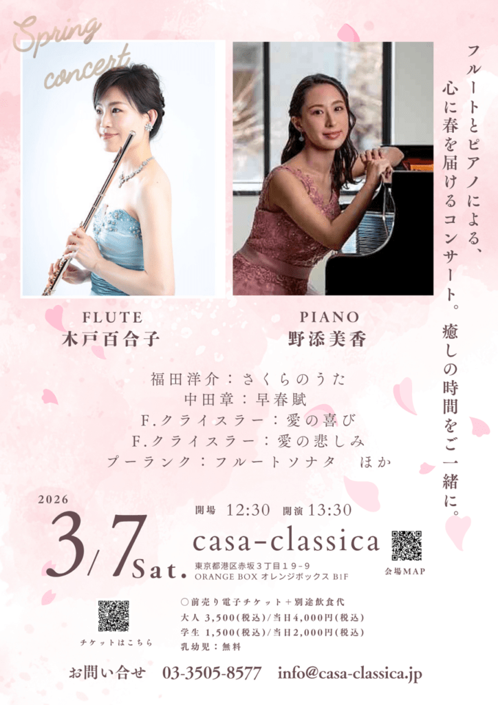 本日の東京クラシック ライブハウス 赤坂カーサクラシカは、木戸百合子さん(フルート)、野添美香さん(ピアノ)のご出演で、~フルートとピアノによる、心に春を届けるコンサート。癒しの時間をご一緒に。~でした。有名クラシック曲、一度は耳にしたことのあるポップス曲、本格クラシック曲までたくさんの曲をご披露くださり、フルートの艶やかな優しい音色とピアノのフルートに寄り添う温かい音色にお客さまもうっとり♪ライブタイトルにもある通り、土曜日の昼下がりにぴったりな癒しの時間となりました。素敵な演奏をありがとうございました!またのご出演を心よりお待ちしております。