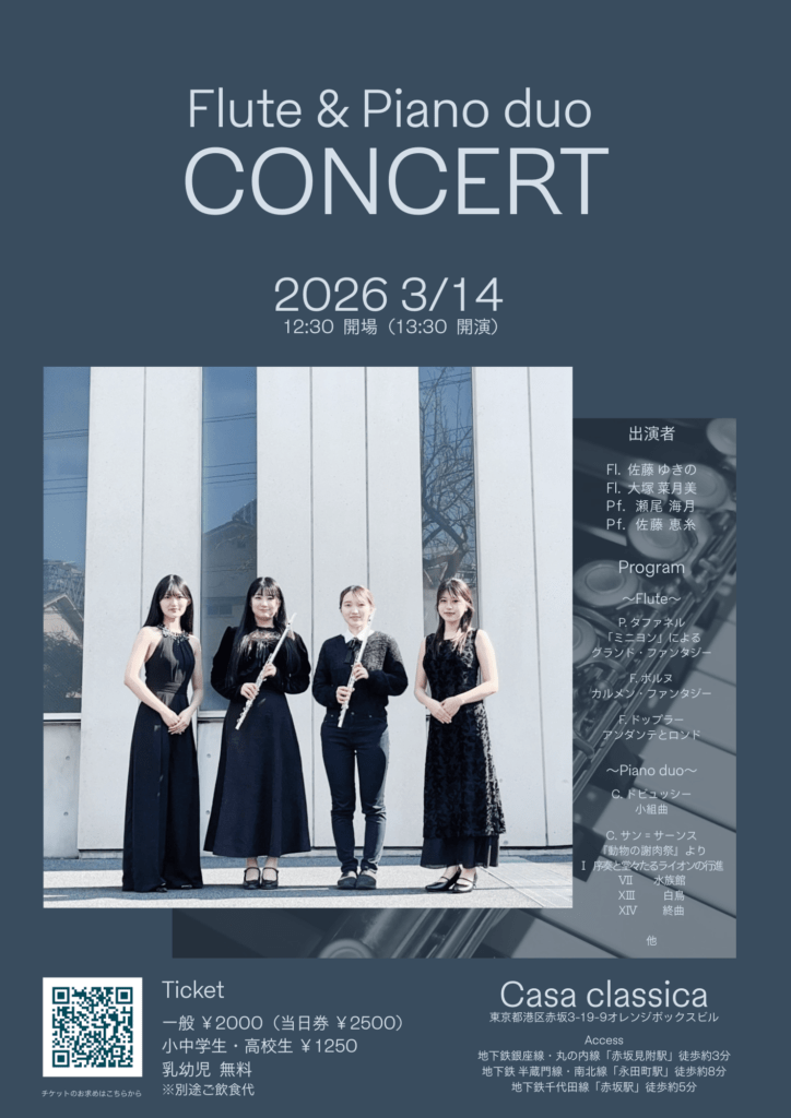 3月14日(土)昼の部 佐藤ゆきの(フルート)大塚菜月美(フルート)瀬尾海月(ピアノ)佐藤恵糸(ピアノ)