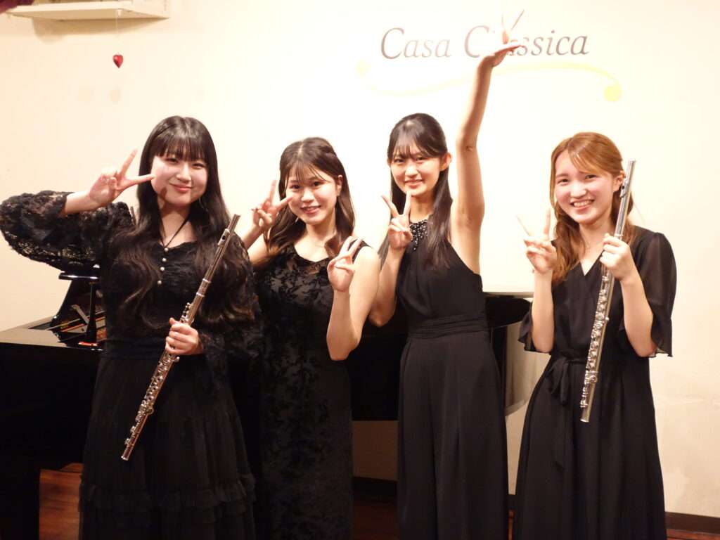 本日の東京クラシック ライブハウス 赤坂カーサクラシカは、佐藤ゆきのさん(フルート)、大塚菜月美さん(フルート)、瀬尾海月さん(ピアノ)、佐藤恵糸さん(ピアノ)のご出演でした。それぞれのソロ、デュオといろいろな組み合わせで共鳴しあう4人の感性が、お客さま方の心を魅了する素敵な午後のひとときでした。柔らかに響き渡るフルートの音色と重なり合うピアノの無限大のハーモニーは楽器そのものの芳醇さを満喫させてくださいました。またのご出演を楽しみにしております。