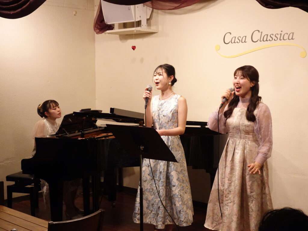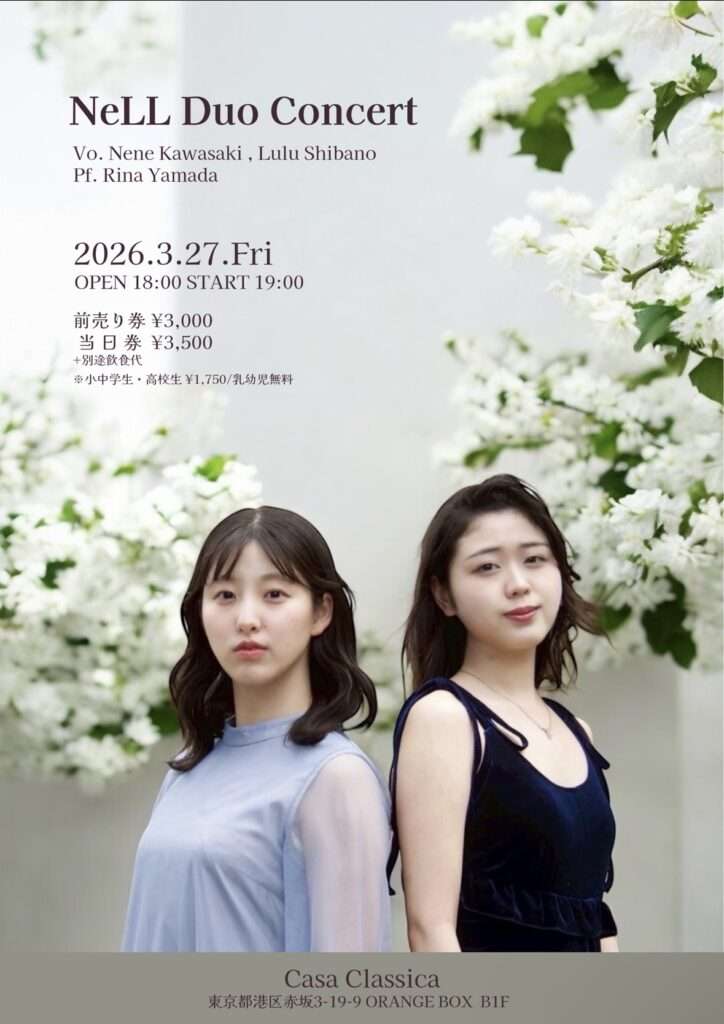 本日の東京クラシック ライブハウス 赤坂カーサクラシカは、NeLL 柴野瑠々さん(ヴォーカル)川﨑音寧さん(ヴォーカル)山田梨菜さん(ピアノ)~Duo Concert~でした。ミュージカルの有名曲、そして隠れた名曲などなど、2ステージにわたってたっぷりお届けくださり、お2人の息も声もぴったりのデュオ、そして力強いソロも聴かせてくださいました。軽快なピアノと伸びやかな歌声にのせて、NeLLのお2人のミュージカルへの想いが伝わる素敵なステージをありがとうございました!これからも更にご活躍が期待される皆さま、カーサクラシカへのまたのご出演もお待ちしております🌟