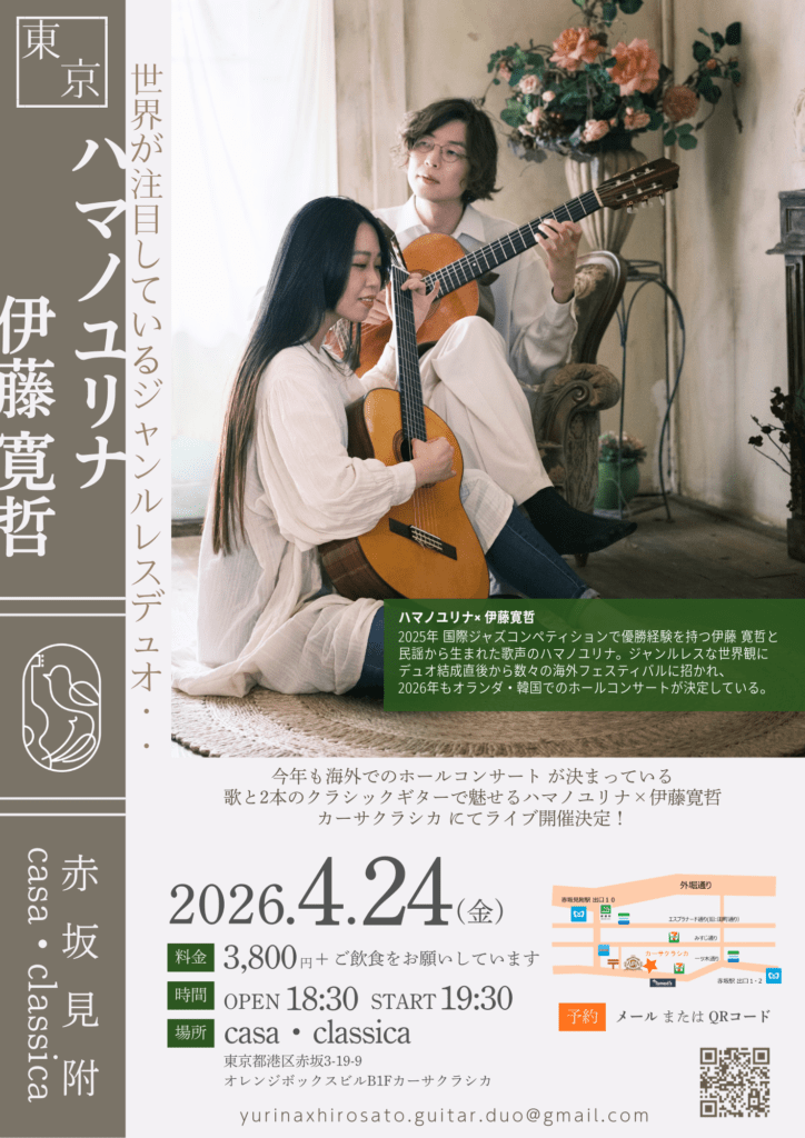 本日の東京クラシック ライブハウス 赤坂カーサクラシカは、ハマノユリナさん(ヴォーカル、ギター)伊藤寛哲さん(ギター)ご出演でした。いつもより照明を落としたステージに癒しのヴォーカル、そしてギターの音色、心に染みていく音楽をお届けくださいました。お客さまも1週間の疲れから解放され、トークと心地よいサウンドに身をゆだねていらっしゃいました。ジャンルを超えた素敵な演奏で国内はもちろん、海外でもご活躍というお2人、カーサクラシカへのまたのご出演もお待ちしております。
