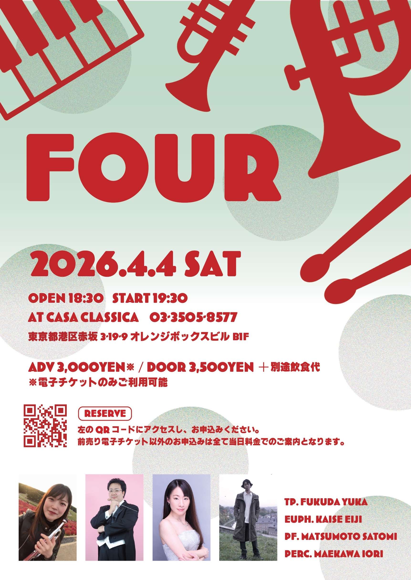 (土)夜の部 福田有加(トランペット・鍵盤ハーモニカ)貝瀬永治(ユーフォニアム)松本聡美(ピアノ)前川維旺利(パーカッション)”four”