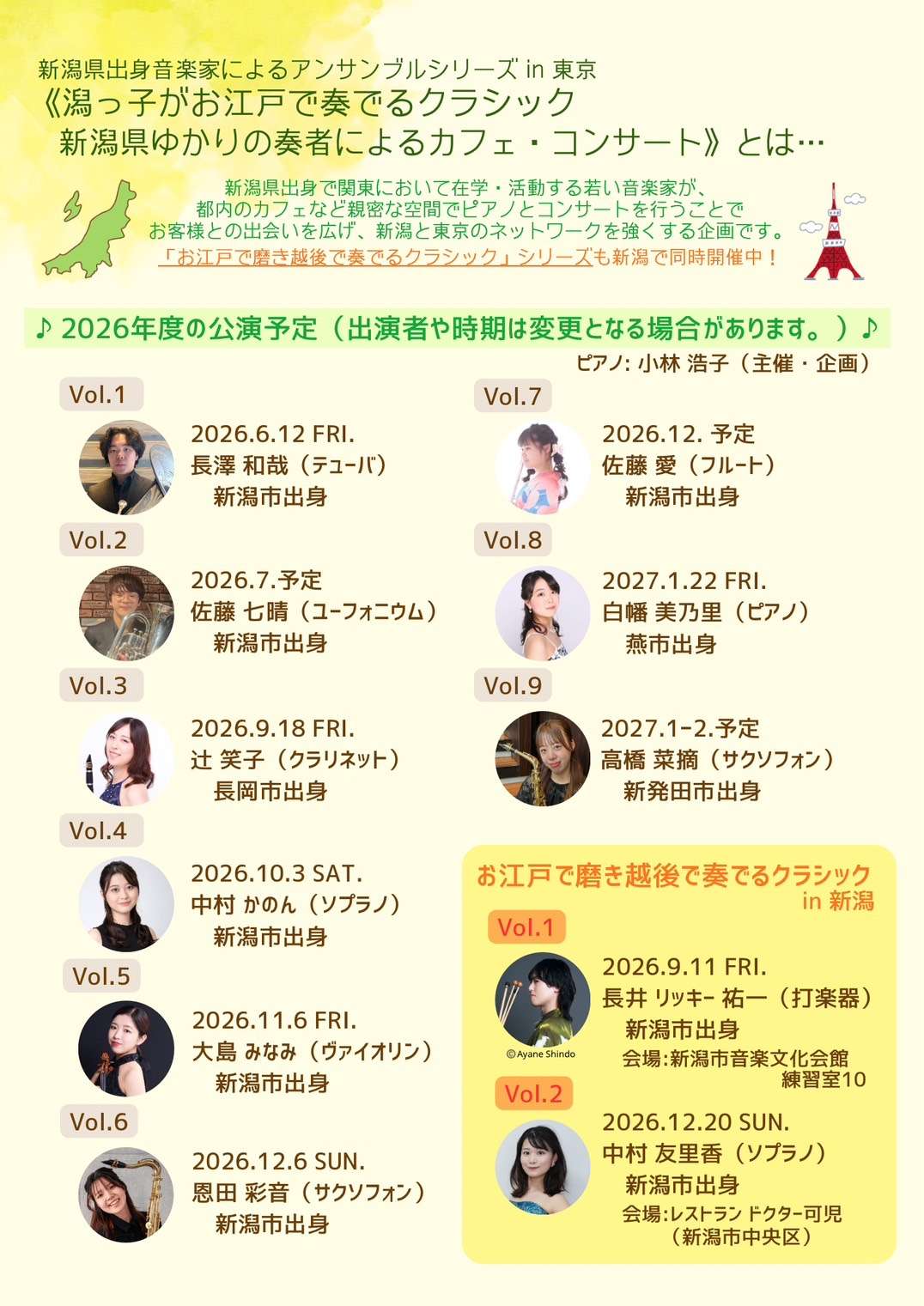 (日)昼の部 恩田彩音(サクソフォン)小林浩子(ピアノ) 2026年12月6日 開場/00:00 開演/00:00 閉店/00:00 大人:前売り電子チケット 未定 円(税込)当日 未定 円/小中学生・高校生:未定円/乳幼児:無料 出演者 恩田彩音(サクソフォン) 小林浩子(ピアノ) ☆ご鑑賞方法 【販売期間】:開催日2か月前~前日23:59 ※ライブ詳細が揃い次第の発行となります。 ※お電話・メールでのご予約は承っておりません。 【当日席について】:残席数・・・チケットページ「在庫数」 で表示 ※残席数がある場合、当日料金でご鑑賞いただけます。ご予約は承っておりません。 Post