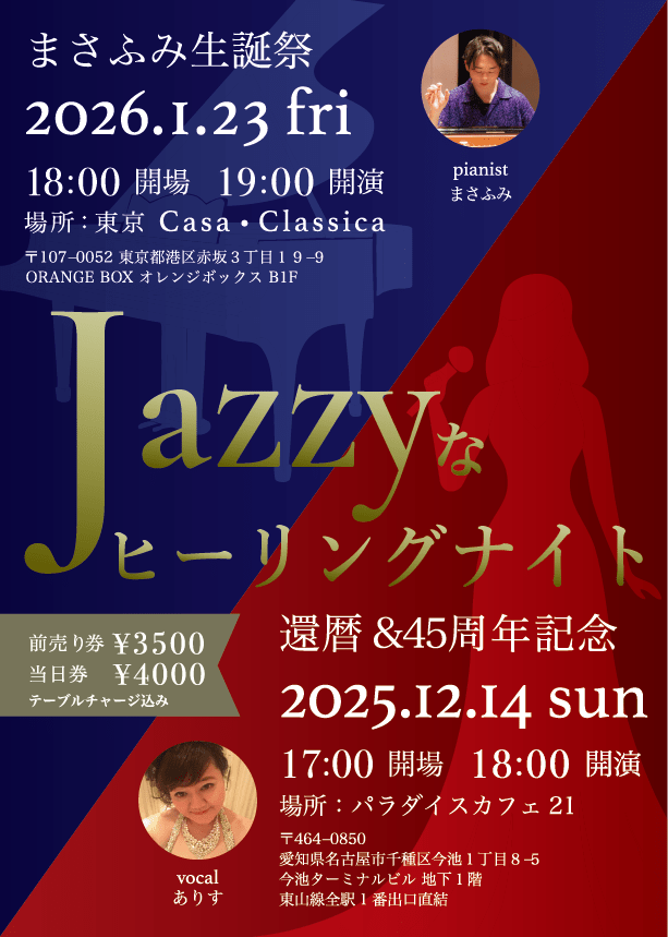 (金)夜の部 ありす(ボーカル)まさふみ(JAZZピアニスト)~ライブタイトルは『Jazzyなヒーリングナイト』~